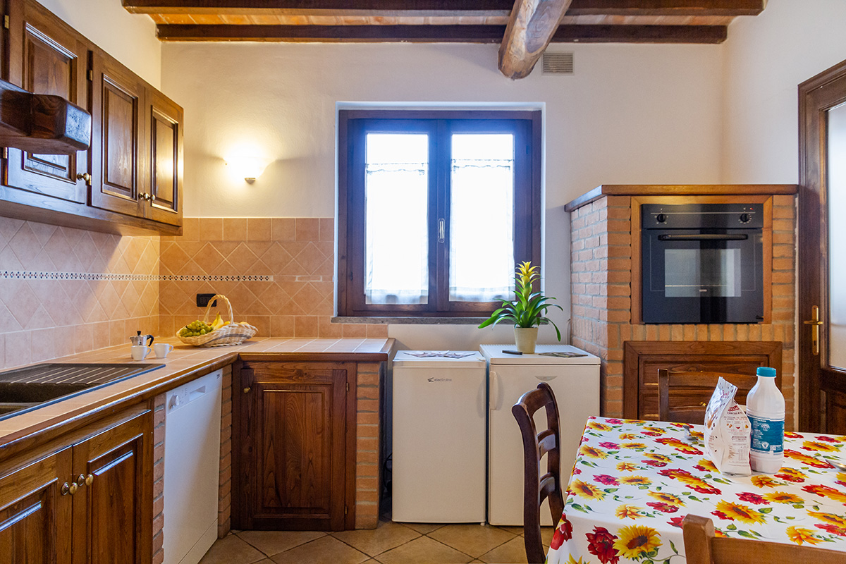 La moderna cucina e’ attrezzata con lavastoviglie, forno e frigorifero con congelatore.