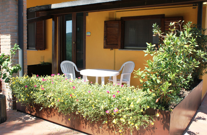 L’appartamento ha la vista sulla piscina e sul giardino.