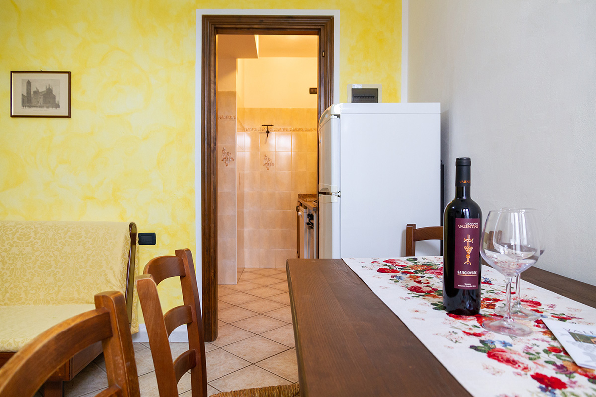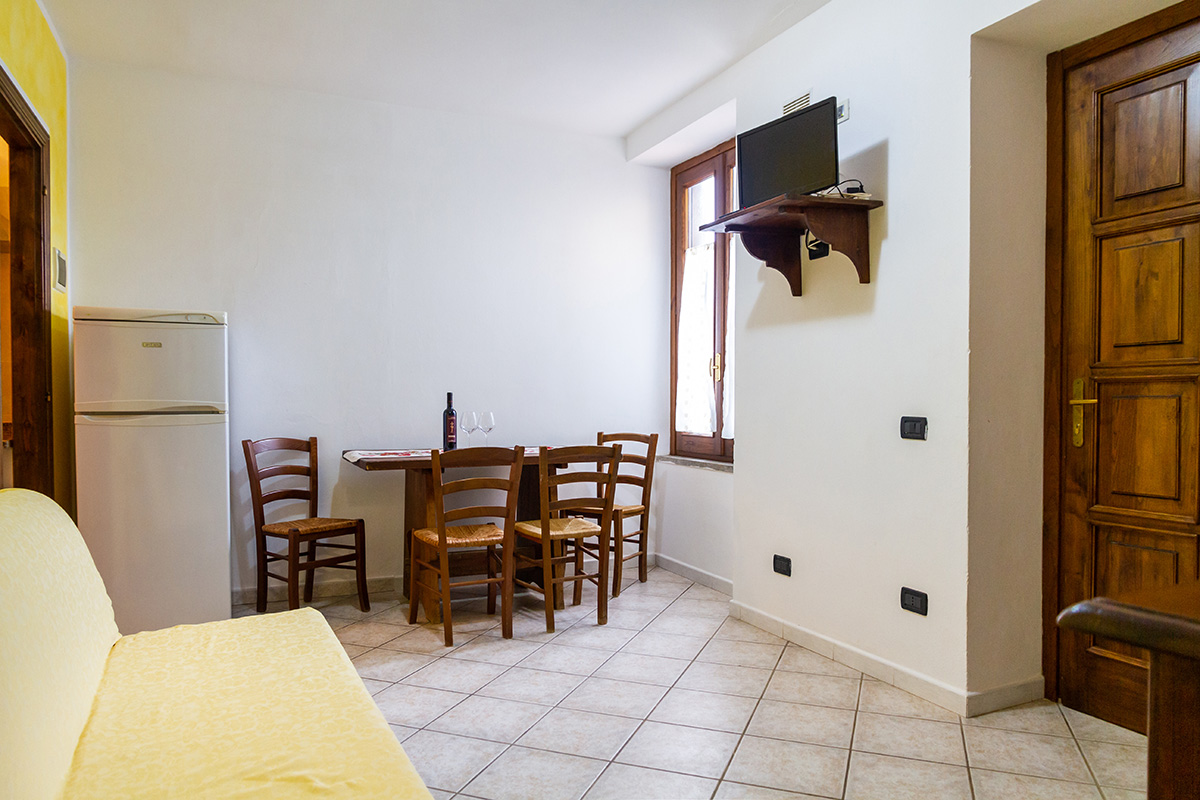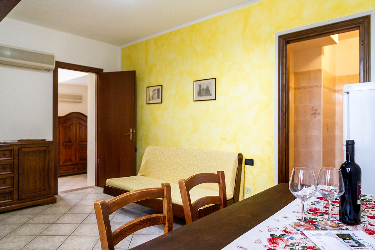Appartamento bilocale al piano terreno con camera da letto matrimoniale, bagno con box doccia e spaziosa zona giorno con divano letto.