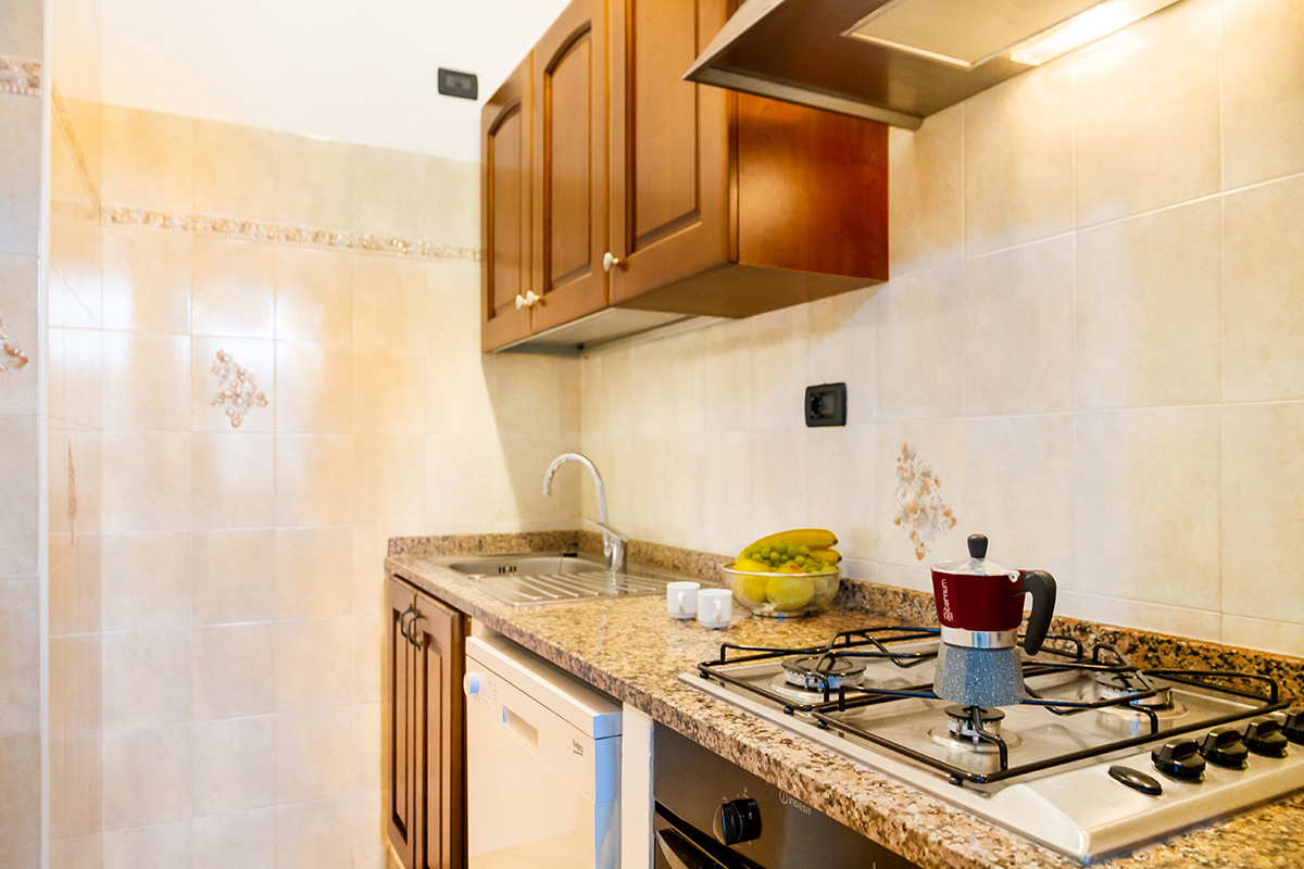 La moderna cucina e’ attrezzata con lavastoviglie, forno e frigorifero con congelatore.